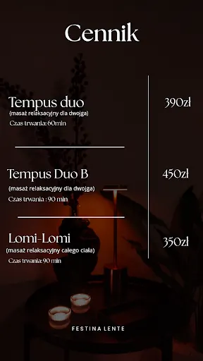 Festina Lente to salon masażu relaksacyjnego zlokalizowany w Częstochowie przy al. Jana Pawła II 56/lok. 5. Miejsce specjalizuje się w zabiegach spa, w tym popularnym masażu relaksacyjnym dla dwojga trwającym 60 minut. Salon cieszy się wysoką oceną 4.9/5 w Google na podstawie 37 opinii, co świadczy o uznaniu klientów. Klienci podkreślają przyjazną atmosferę od pierwszych chwil – miłą obsługę, spokojną muzykę w tle i dbałość o szczegóły, takie jak wybór kosmetyków wysokiej jakości. Masaże wykonują doświadczeni specjaliści, w tym pan Olivier i pani Klementyna, którzy dbają o komfort i indywidualne potrzeby gości. Wielu chwali relaks dla ciała i duszy, możliwość skorzystania z dwóch łóżek dla par oraz czysty, zadbany wystrój sprzyjający wyciszeniu. Opinie wskazują na profesjonalizm, rozsądne ceny i chęć powrotu. Salon Festina Lente to dobre miejsce dla osób szukających odprężenia w codziennym biegu. Klienci polecają je jako przestrzeń pełną spokoju i wysokiej jakości usług, idealną na chwilę relaksu w sercu Częstochowy. (198 słów)